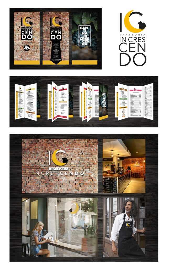 Creación e implantación de Logotipo  para Trattoria Increscendo, en el modernizado barrio de Arganzuela, Madrid.